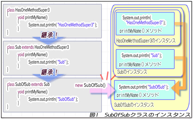 この時、HasOneMethodSuper3クラスとSubクラスのprintMyName()メソッドはSubOfSubクラスのprintMyName()メソッドに結びつけられます。