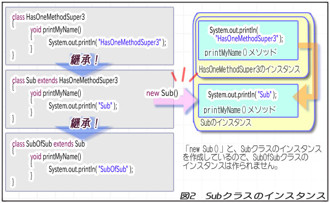 プログラムだけ見ると、なんだか「どのクラスのインスタンスを作っても、SubOfSubクラスのインスタンスが作られる」ように見えるかもしれません。自分でクラスを作ると、特にそうです。
