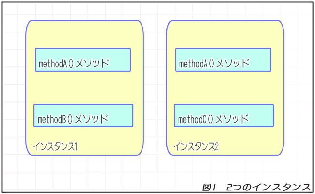 インスタンス1はmethodA()メソッドとmethodB()メソッドを持っています。