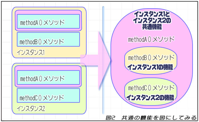 このように図を書くと、「インスタンス1の機能」は「橙」の機能+「ピンク」の機能、「インスタンス2」の機能は「緑」の機能+「ピンク」の機能ということになります。