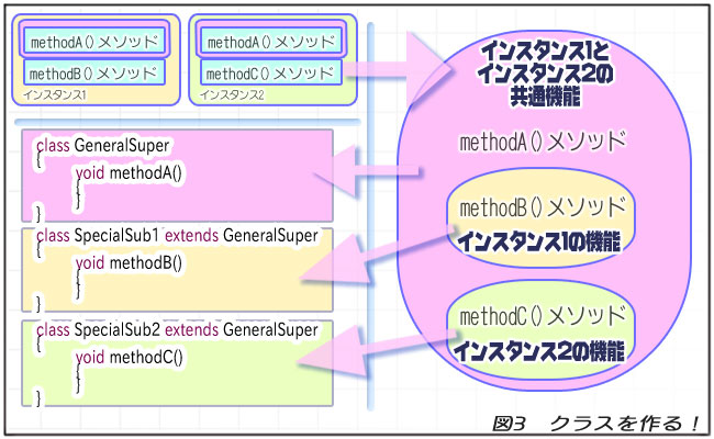 前ページで出てきた「スーパークラス」と「サブクラス」、そしてインスタンスの関係については分かったと思います。