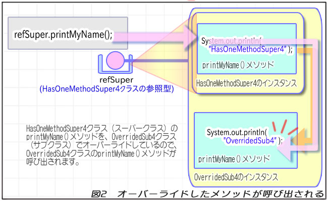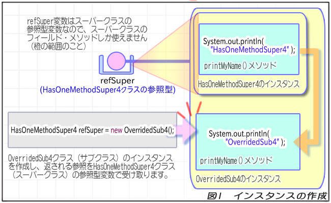 // インスタンスを1つ作ります。 // ただし、参照型変数の型はスーパークラスです。 HasOneMethodSuper4 refSuper = new OverridedSub4();