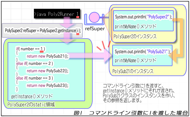 // コマンドライン引数をint型に変換します。 int i = Integer.parseInt( args[0] ); // PolySuper2クラスのstaticメソッドを使って // インスタンスを取得します。 PolySuper2 refSuper = PolySuper2.getInstance( i ); // printMyName()メソッドを呼び出します。 refSuper.printMyName(); // 出力結果はコマンドライン引数にどの値を渡したかで変わります。