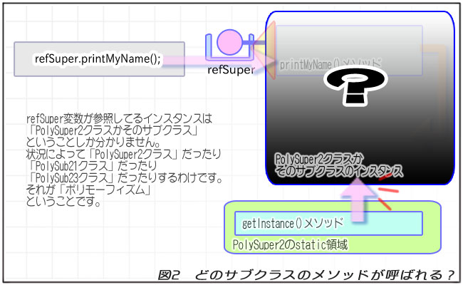 つまりこの例では、「refSuper.printMyName();」というプログラムからは「どのインスタンスのprintMyName()メソッドを呼び出しているのか分からない」ということです。