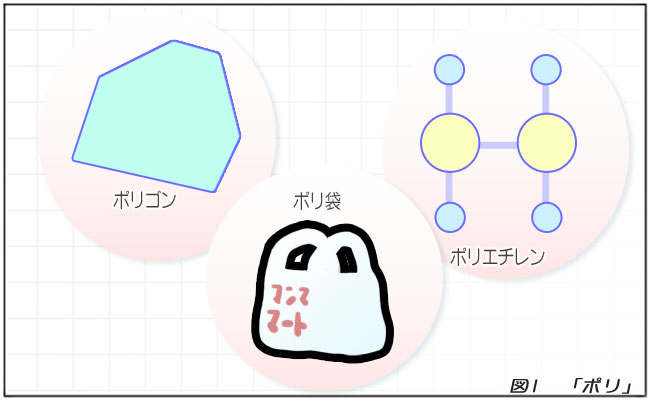 また、「ポリエチレン」の「ポリ」もこの意味です。「ポリエチレン」は「エチレン」という物質が複数組み合わさって作られたものです。このように化学物質の名前によく使われていて、そういう意味では「ポリ袋」の「ポリ」も同じです。