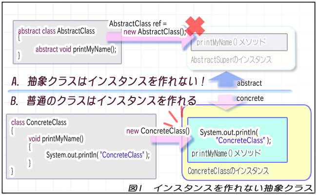 // 抽象クラスはインスタンスを作れません! AbstractClass ref = new AbstractClass(); // コンパイルエラー: // AbstractClassRunner.java:18: // AbstractClass は abstract です。 // インスタンスを生成することはできません。 // AbstractClass ref = new AbstractClass(); // ^
