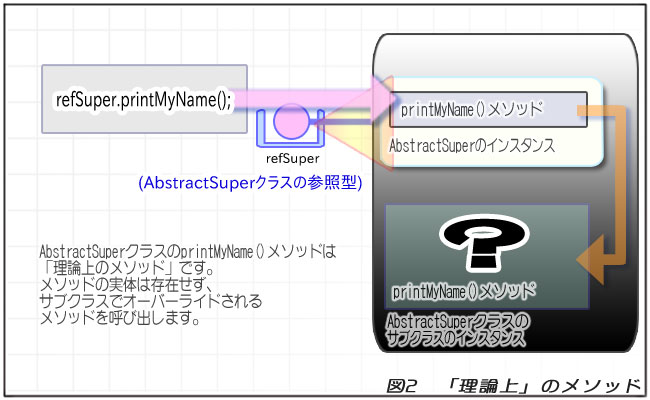 このメソッド、抽象メソッドですから実体は存在しません。でも、参照先のインスタンスには存在しているはずです。