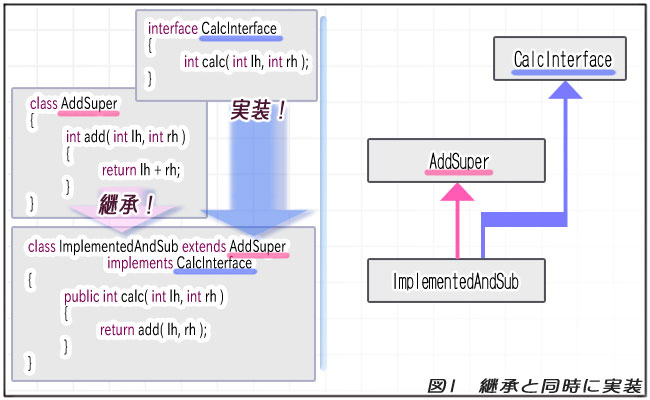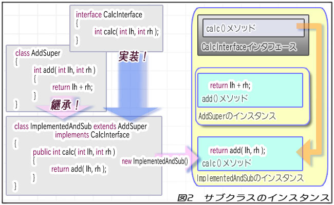 AddSuperクラスをCalcInterfaceインタフェースの実装クラスにしたい……そういう場合には、AddSuperクラスのサブクラスを作り、さらにそれをCalcInterfaceインタフェースの実装クラスにします。