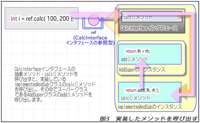 まずImplementedAndSubクラスのインスタンスを作り、CalcInterfaceインタフェースの参照型変数で受け取ります。