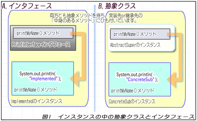 インタフェースは「10.1 インタフェースという「抽象クラスっぽいもの」のPrintInterfaceインタフェースとImplementedクラス、抽象クラスは「9.1 abstractクラスとabstractメソッド」のAbstractSuperクラスとConcreteSubクラスを例に見てみます。