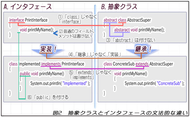 (1):抽象クラスの「class」はインタフェースでは「interface」を使用します。