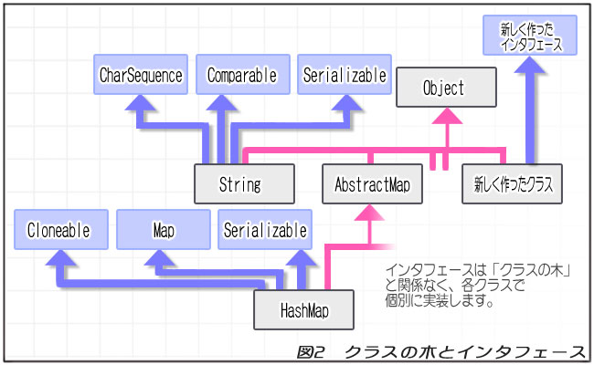 このように、インタフェースはクラスの木の継承関係とはまったく関係なく、クラスひとつひとつに個別にくっついているわけです。