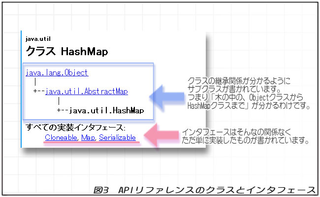 実際、APIリファレンスを見てみると、クラスは「木」としてスーパークラス・サブクラスの関係が分かるよう書かれているのに、インタフェースは単に「実装した」とだけしか書かれていません。