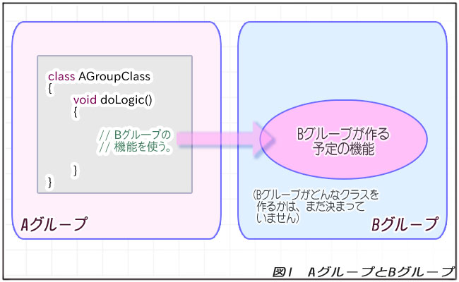 AグループにはAGroupClassクラスがあり、その中でBグループが作る予定の機能を使っています。ただ、まだ細かい所までは決まっていないため、Bグループがどういうクラスを作るかまでは分かりません。とりあえず「Aグループが必要な機能をBグループが作る」、ということだけは分かっています。
