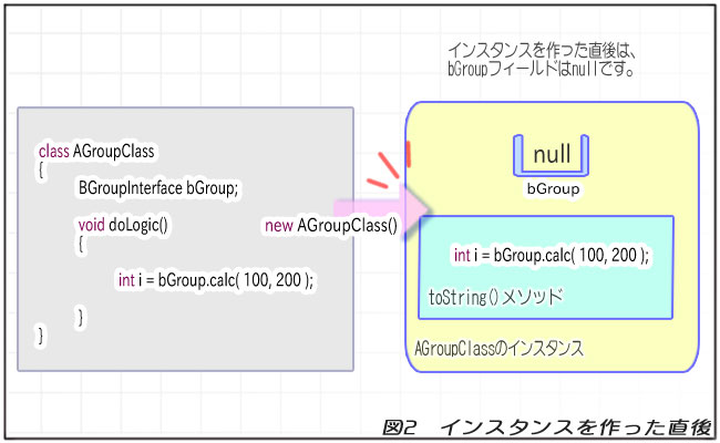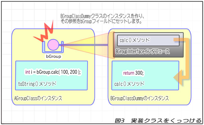 インタフェースにダミークラスを連結する――そんなイメージで、bGroupフィールドにBGroupClassDummyクラスのインスタンスの参照をセットします。