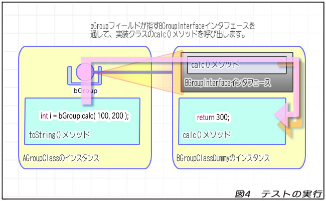 そうすると、インタフェースを通してBGroupClassDummyクラスのメソッドを呼び出すことができるようになります。