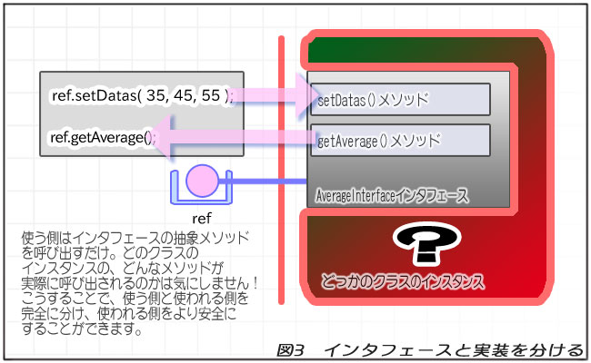 setDatas()メソッドやgetAverage()メソッドはAverageInterfaceインタフェースの参照型変数を通して呼び出しています。