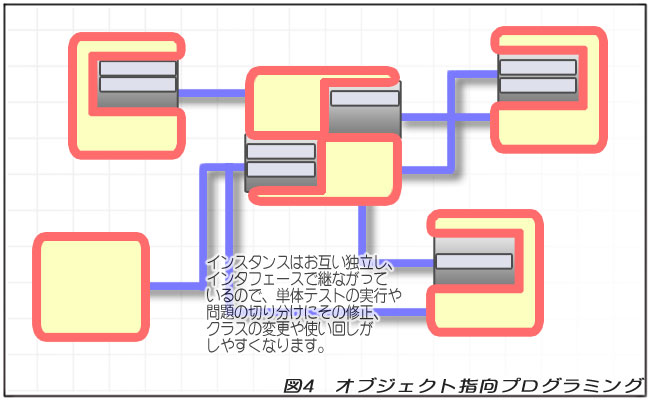 このようにすると、単体テストが簡単にでき、問題が発生した場合の切り分けも容易で、修正しても影響範囲が小さく、さらに使い回しも簡単にできます。