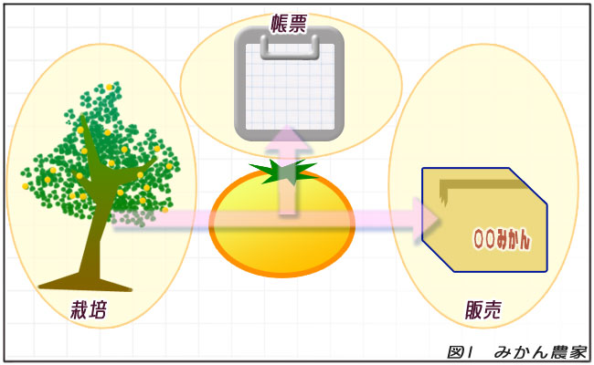 みかん農家では、数品種のみかんを作っていたとします。各品種のみかんについてどの場所にどれだけ作付けするか、今どれだけ育っているか、といった栽培の管理や、みかんを販売する際に、どの品種をどこの卸にどれだけ販売したのか、また個人顧客への通販で誰にいつ何個売ったのか、そしてそれらの売上やコスト、利益を計算する――そういったことをIT化したいとします。