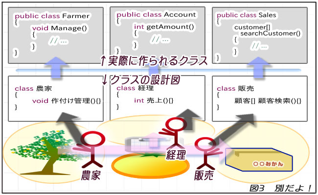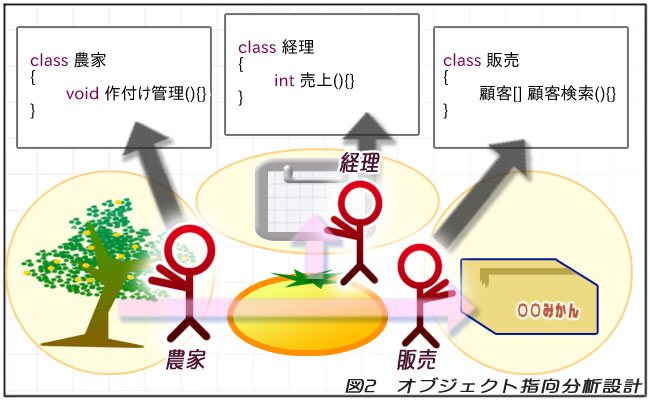 この考え方は「オブジェクト指向分析設計」で、いかに現実社会をクラスに置き換えるか、そういう設計技法であって、それを実際に実現するのが「オブジェクト指向プログラミング」ということになります。
