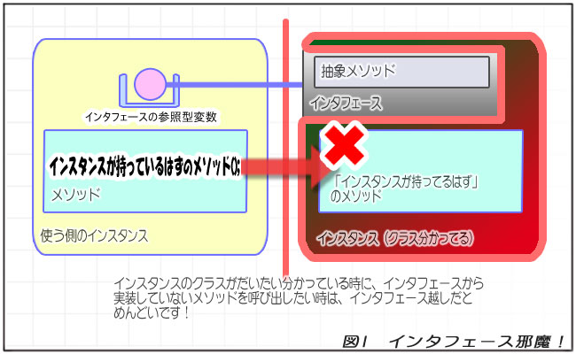 そのため、インタフェースを使うのは、ちゃんと仕様が決まっていて、かっちり作れるような場合でないとあとあと大変なことになるわけです。