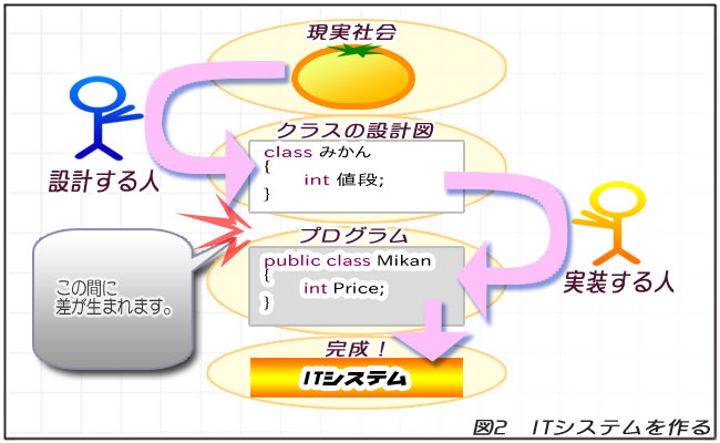 ITシステムを作るときには、まず「オブジェクト指向分析設計」でクラスの設計図を作り、それを元に「オブジェクト指向プログラミング」を使ってプログラムを作ることになります。