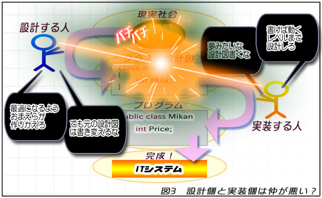 ですが、「設計」側は「それをやったらプログラマーの仕事なくなるだろ」と思い、「実装」側は「設計図通りに作るのが俺たちの仕事じゃね?」と考え、結局どちらもその変換をいやがりますし、まぁどうせどちらもうまい変換はできません。