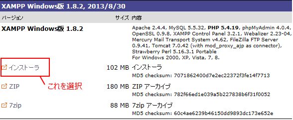 また、肝心のPerlは、Strawberry Perl 5.16 が同梱されています。 下記ページの XAMPP Winodws版の「インストーラ」タイプを選択し、ダウンロードしましょう。