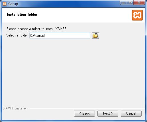 インストールするフォルダを指定します。デフォルトの「C:\xampp」のままで構いません。