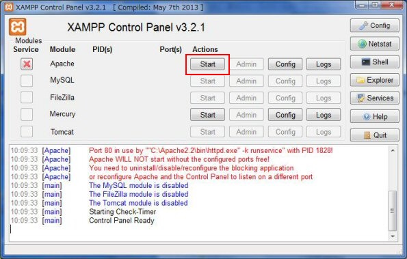 XAMPPコントロールパネル起動方法:「スタートボタン」→「すべてのプログラム」→「XAMPP」→「XAMPP Control Panel」