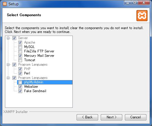 デフォルトで全てにチェックが入っています。 ここはお好みで構いませんが、Perl、Apache、Fake Sendmail の3つは必ずチェックを入れておきます。