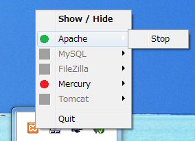 もし赤色で停止中であれば、「Apache」をクリックすることで、起動します。あるいは、上部の「Show / Hide」をクリックすれば、コントロールパネルが開きますので、そこで操作をしても構いません。
