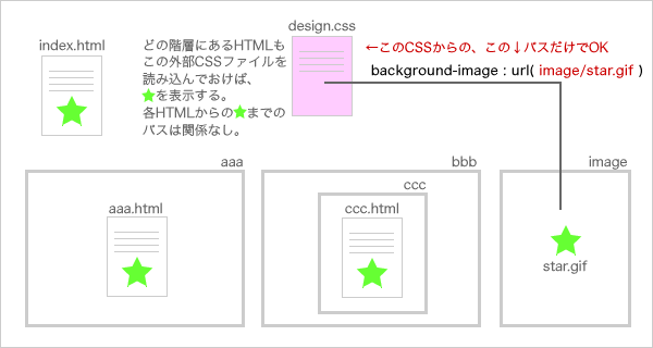 外部CSSにすれば、画像のパスはそのCSSファイルからのパス。異なる階層にあるHTMLファイルで使っても同一のCSSで済む。編集も、1枚のCSSファイルを修正するだけでOK。