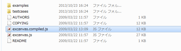 このうち使用するのは、圧縮版の方(excanvas.compiled.js)です。 これを、HTML5ファイルがあるフォルダにコピーして名前を書き換えましょう。 ここでは「excanvas.js」にします。