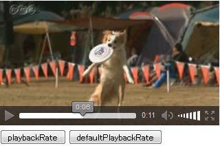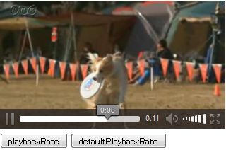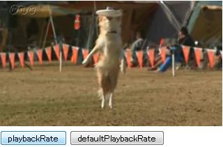 速度変更関数を呼び出す2つのボタンを設置しています。最初がplaybackRateによる変更、次がdefaultPlaybackRateによる変更を行ないます。