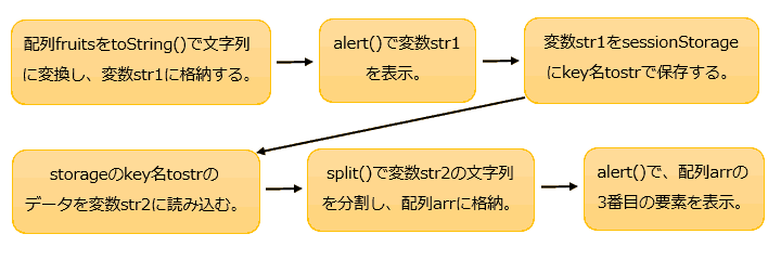 続いて「ブドウ」と表示されます。Storageから読み出して配列に戻し、配列arrに格納した2番目の要素は、 配列fruitsの2番目の要素と同じであることが確認できました。