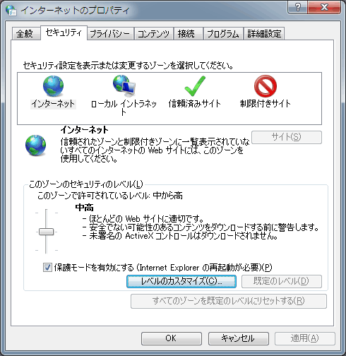 インターネットオプションの「セキュリティ」タブを開きます。 そして「セキュリティのレベル」の所にあるレベルのカスタマイズをクリック。