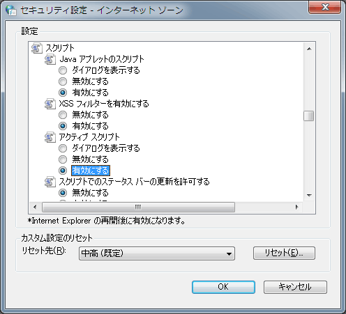 セキュリティの設定ダイアログが出ます。 スクリプト→アクティブ スクリプトの部分を「有効にする」にしたらJavaScriptが動きます。 「無効にする」にすれば、JavaScriptをOFFにできます。