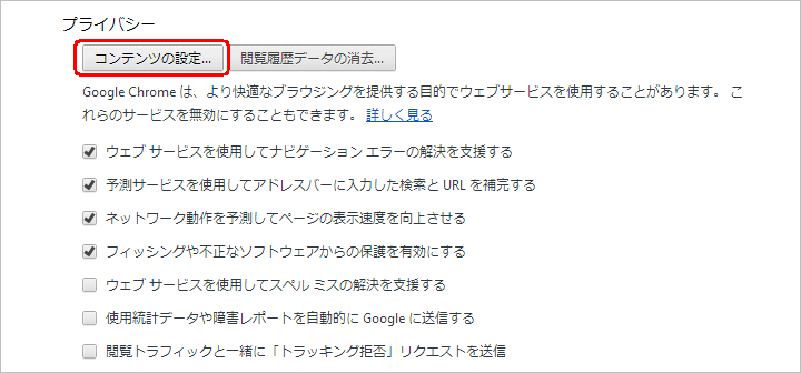 プライバシーという見出しの部分に、コンテンツの設定...ボタンがあるので、クリックします。