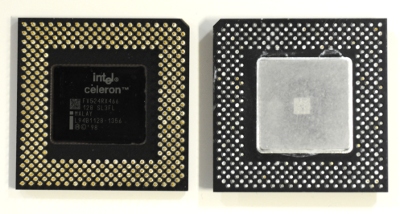 ここで使われているCPUです。裏側にピンが剣山のように出ています。このCPUの動作周波数は400MHz、現在は2G,3Gのものが出ています。3GHzは3000MHzです。性能は大きく変わっていますし、ソケットのピン数も変わりましたが薄い正方形の板の片側からピンが出て反対側にヒートシンクを着けるという形は今も変わりません。