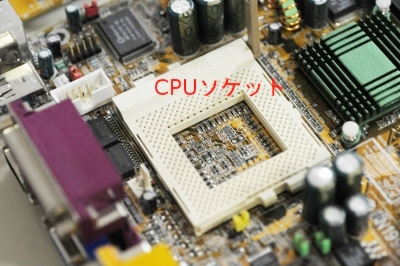 CPUを取り外すとソケットが見えます。周りの小さな穴はこの時代で370個ありCPUのピンが刺さるようになっています。このピン数も増加していきます。