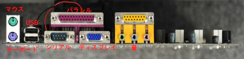 パラレルポートは主にプリンタ、シリアルポートはモデムなどをつなぐものでしたが、最近はUSBに替わってしまいました。このマザーが出た時代(1999年あたり)はUSBが本格的に使われ始めた時代でした。