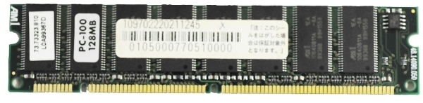 この時代はSDRAMと呼ばれたもの。この後DDR,DDR2,DDR3と変わって、コネクタの規格も変わります。もちろん容量も写真の物は128MB、現在は2GB(2000MB)も珍しくありません。しかしスロットに差し込む形は今も変わっていません。