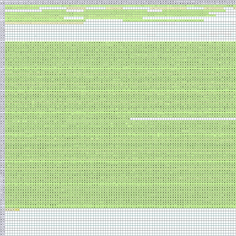 JIS X 0208の全体です。空いているところは将来の追加のためでした。黄色の部分はその追加された部分です。