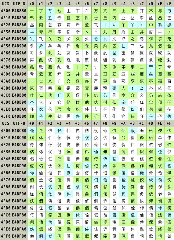 以下はUnicodeの表のごく一部です。緑色部分が JIS X 0208 にある文字。水色部分が JIS X 0213:2004 で追加された文字。白い色の部分は中国や韓国の由来でJISにない文字です。