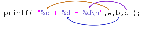 c にあらかじめ a+b の結果を代入する代わりに、printf の中で a+b を計算させることができます。a+b の結果が3番目の %d に対応します。実行結果は同じです。