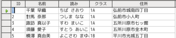 「千葉早織、ちばさおり、1A、弘前市城南四丁目」というデータ間には関連がある。