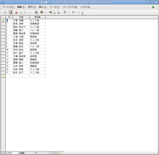 テーブルの「部活動」をダブルクリックすると部活動が表になって表示されます。[×]ボタンで閉じます。