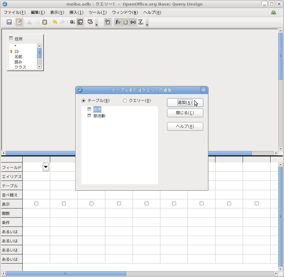 「テーブルまたはクエリーの追加」ダイアログで「住所」追加した後、「部活動」も追加します。