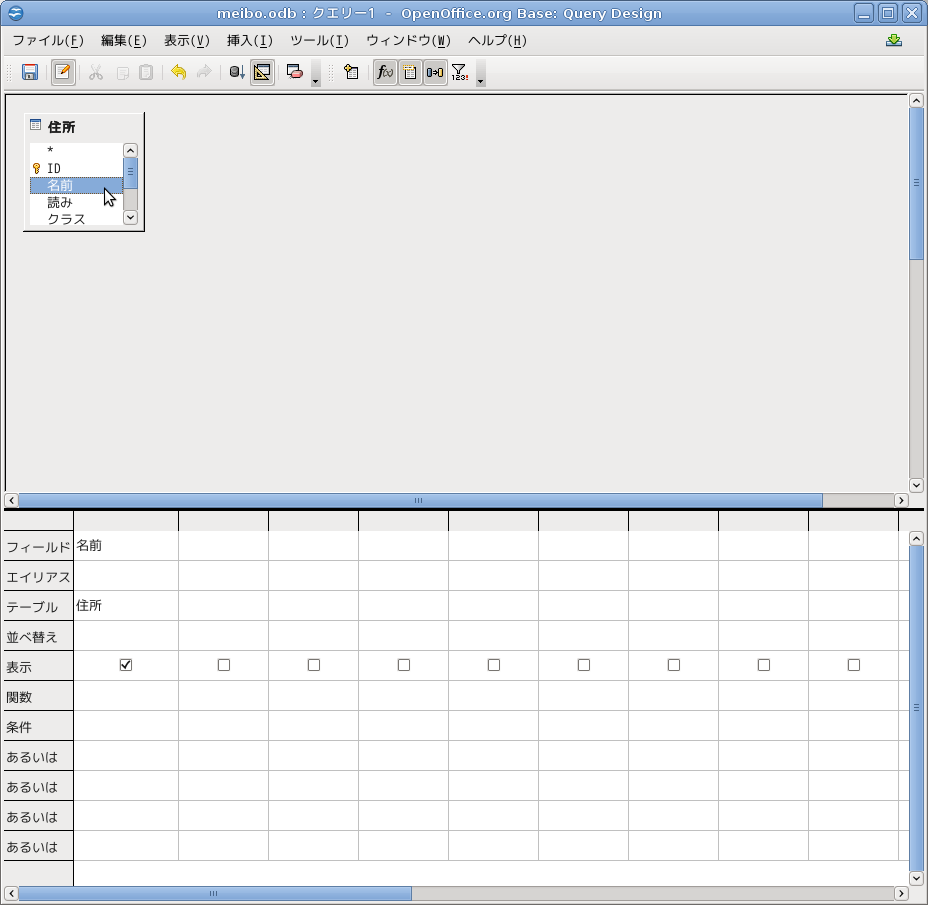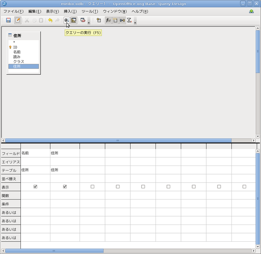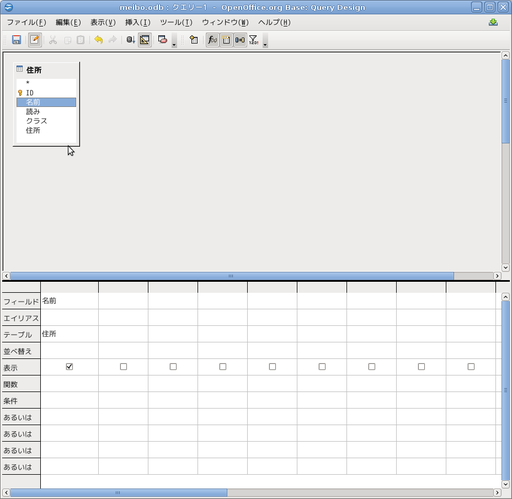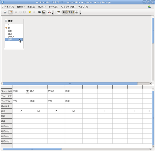 「住所」の表の属性から名前の属性をダブルクリックで選びます。下半分の1つめの列に属性名が出ます。